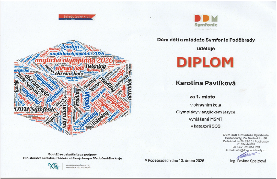 Blahopřejeme Karolíně Pavlíkové ze třídy 1. L, která zvítězila v okresním kole olympiády v anglickém jazyce. Super úspěch!!!