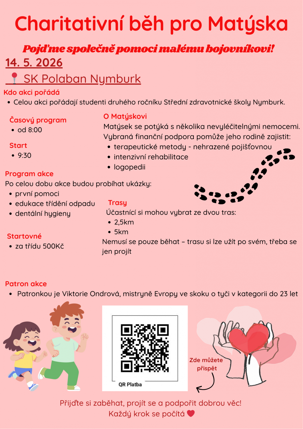 ŹÁCI DRUHÉHO LYCEA VÁS SRDEČNĚ ZVOU NA CHARITATIVNĚ SPORTOVN AKCI SE ZAJÍMAVÝM DOPROVODNÝM PROGRAMEM - CHARITATIVNÍ BĚH PRO MATÝSKA - KTERÝ SE BUDE KONAT 14. 5. 2026 VE SPORTOVNÍM AREÁLU VESLÁK V NYMBURCE. ZLEPŠETE SVŮJ WELLBEING PŘÍJEMNÝM POHYBEM V PŘÍRODĚ A VĚDOMÍM, ŽE PODPOŘÍTE JEDNOHO MALÉHO BOJOVNÍKA . VÍCE NA LETÁCÍCH. Akce bude probíhat v průběhu celého dne, v dopoledních hodinách je určena pro školy a v odpoledních široké veřejnosti.