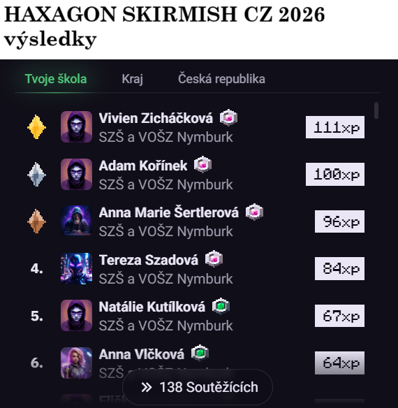 Ve dnech 6. až 17. dubna 2026 se naše škola zúčastnila celorepublikové soutěže HAXAGON SKIRMISH CZ 2026 v IT a kybernetické bezpečnosti. V letošním ročníku jsme se umístili na 15. místě v kraji a na 34. místě v České republice z 295 zúčastněných škol.